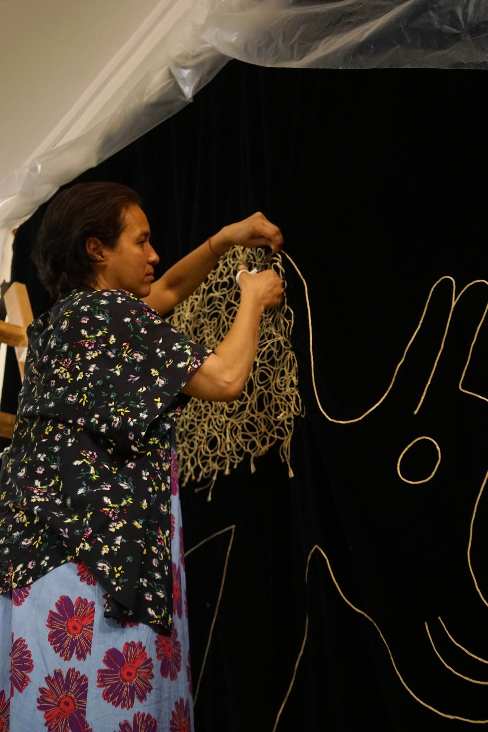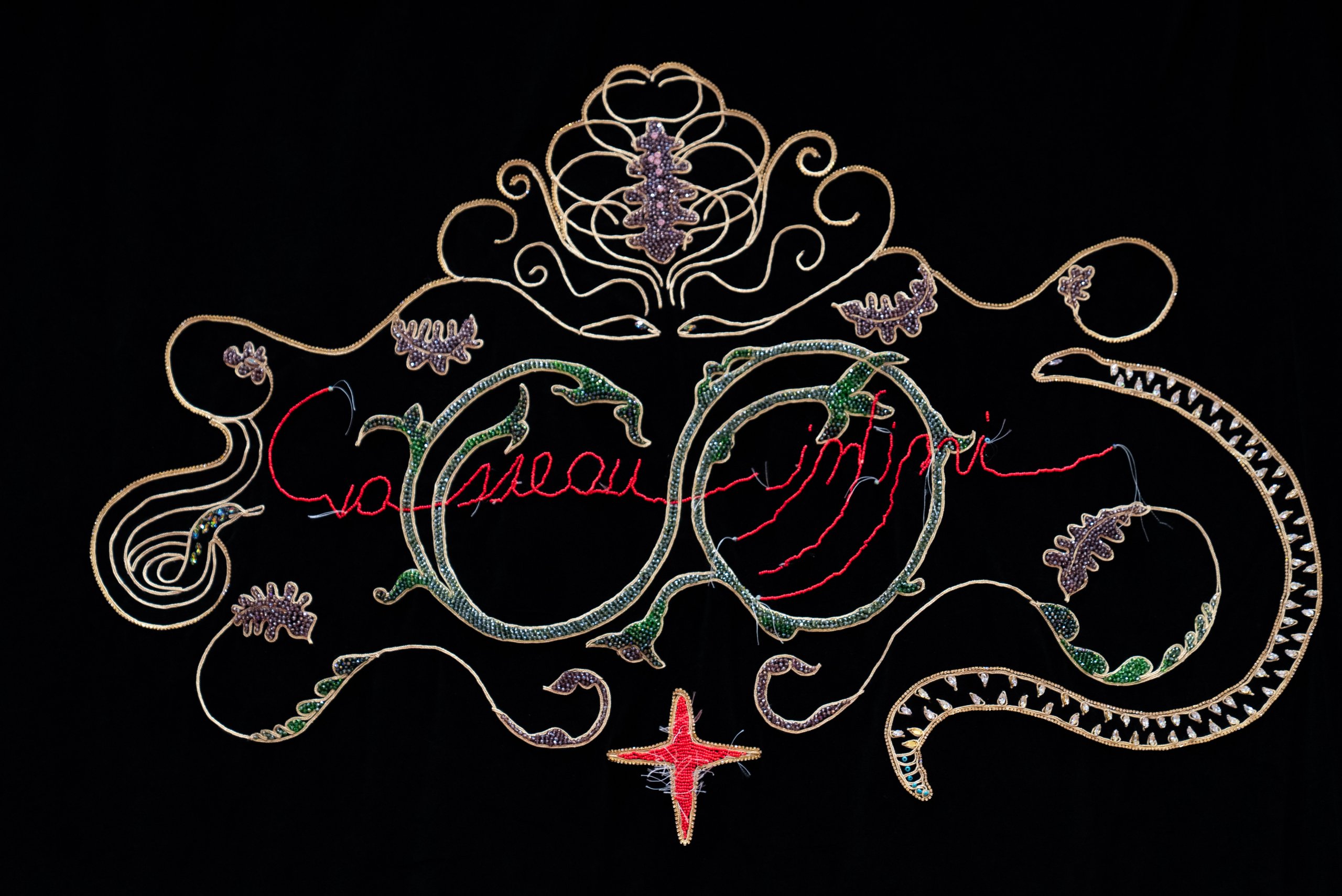 Arlette-Louise Ndakoze porte son regard sur des sociétés africaines millénaires – dont les philosophies qui découlent de la force vitale – pour questionner les dessins dans les grottes du Tassili à travers la broderie de l’artiste. Le point de départ sera la notion de ce que le philosophe rwandais Alexis Kagame a compris comme « traditions vitales » en les démarquant de la notion « d’histoire » dans les philosophies occidentales dont l’axe de temps suit une trajectoire linéaire artificielle. Qu’est-ce qui, du mouvement de l’artiste Dalila Dalleas Bouzar, nous fait saisir des formes de vies de la grotte, qu’est-ce qui ouvre l’imaginaire à l’intérieur et à l’extérieur de l’image perçue de la broderie ? L’écart qui sépare les vies d’antan et d’aujourd’hui sera mis en valeur comme une possibilité créative à partir de laquelle des formes contemporaines se dessinent concrètement.