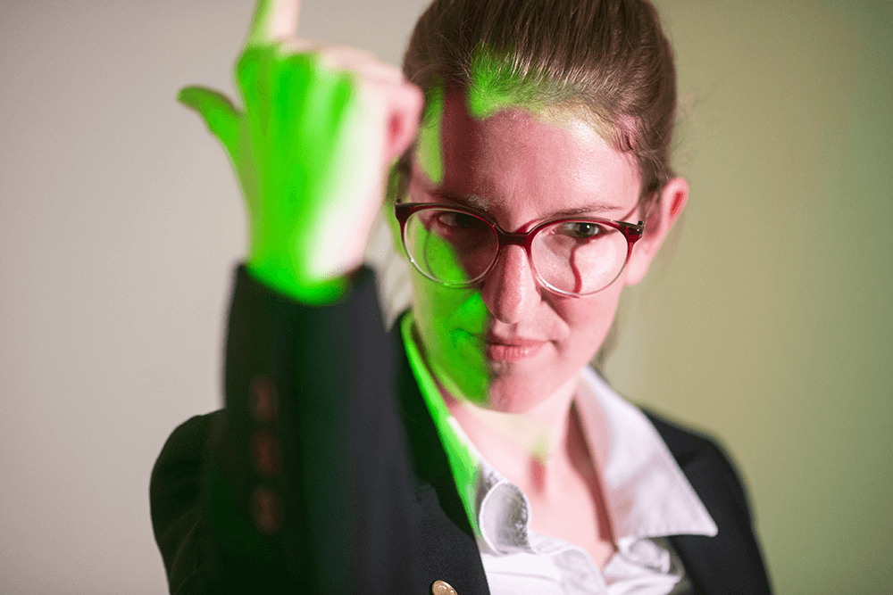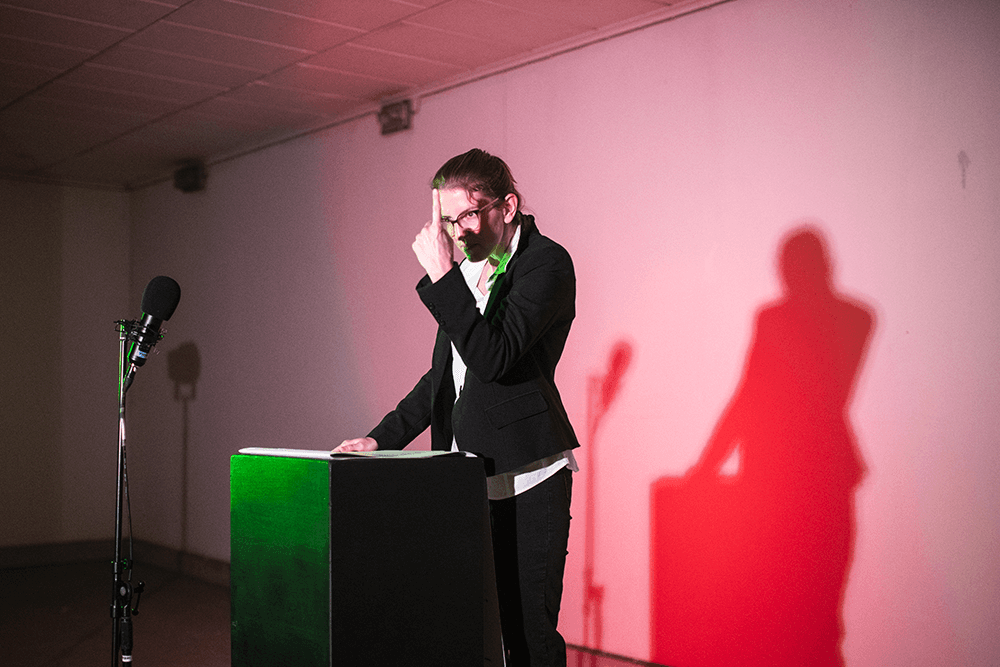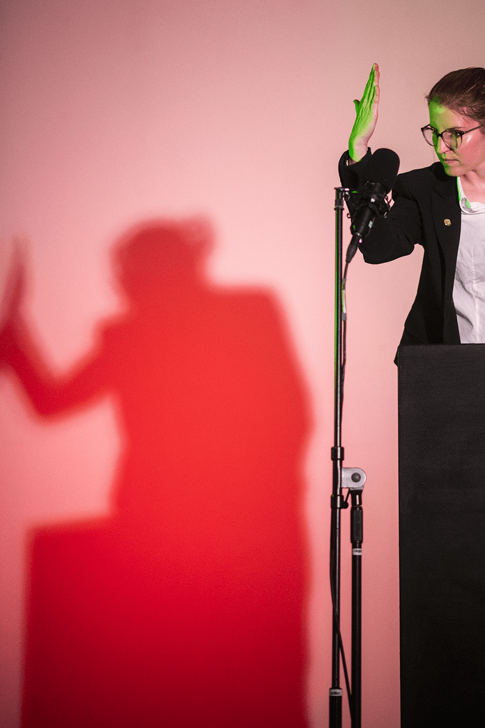 Le medium de la performance exigeant l’incarnation, sa pratique lui permet de se reconnecter à son corps. Par l’intermédiaire du grotesque, elle tente de démontrer l’absurdité de la normalisation, ainsi que la dominance du langage oral.