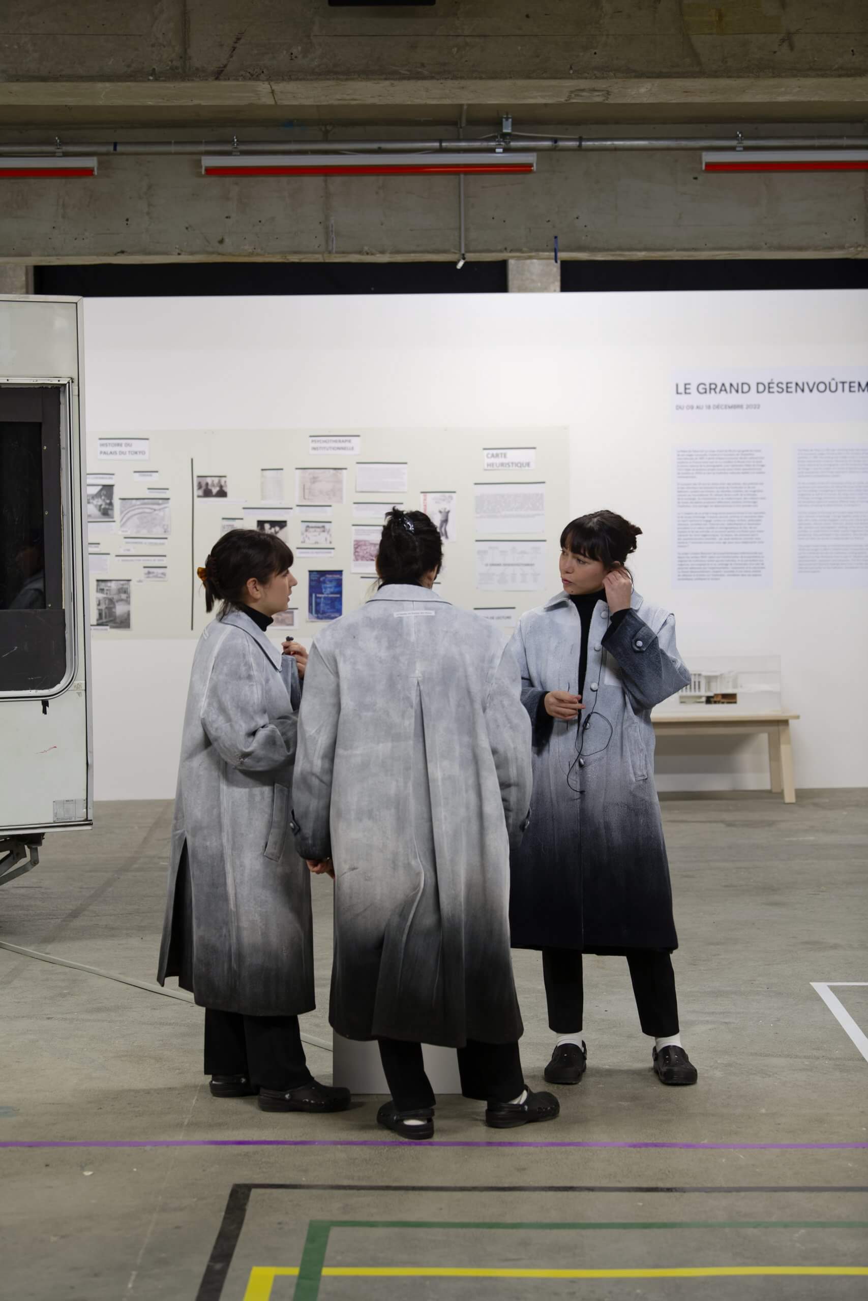 Cette double dimension publique et interne rapproche ce projet à la psychothérapie institutionnelle, une pratique qui, depuis les années 1940, opère une transformation de la psychiatrie en soignant les institutions autant que les individus, et en invitant les soigné·es, les employé·es et le voisinage à s’émanciper d’un état de « passivité obéissante » à travers l’improvisation, l’expression individuelle, collective et la subversion. Ce premier chapitre du Grand désenvoûtement procède d’une même volonté de réflexion et d’action des différents éléments constitutifs du Palais de Tokyo dans son contexte symbolique, politique et social, ainsi que d’une réflexion plus large sur des aspirations et des manières de faire collectives.