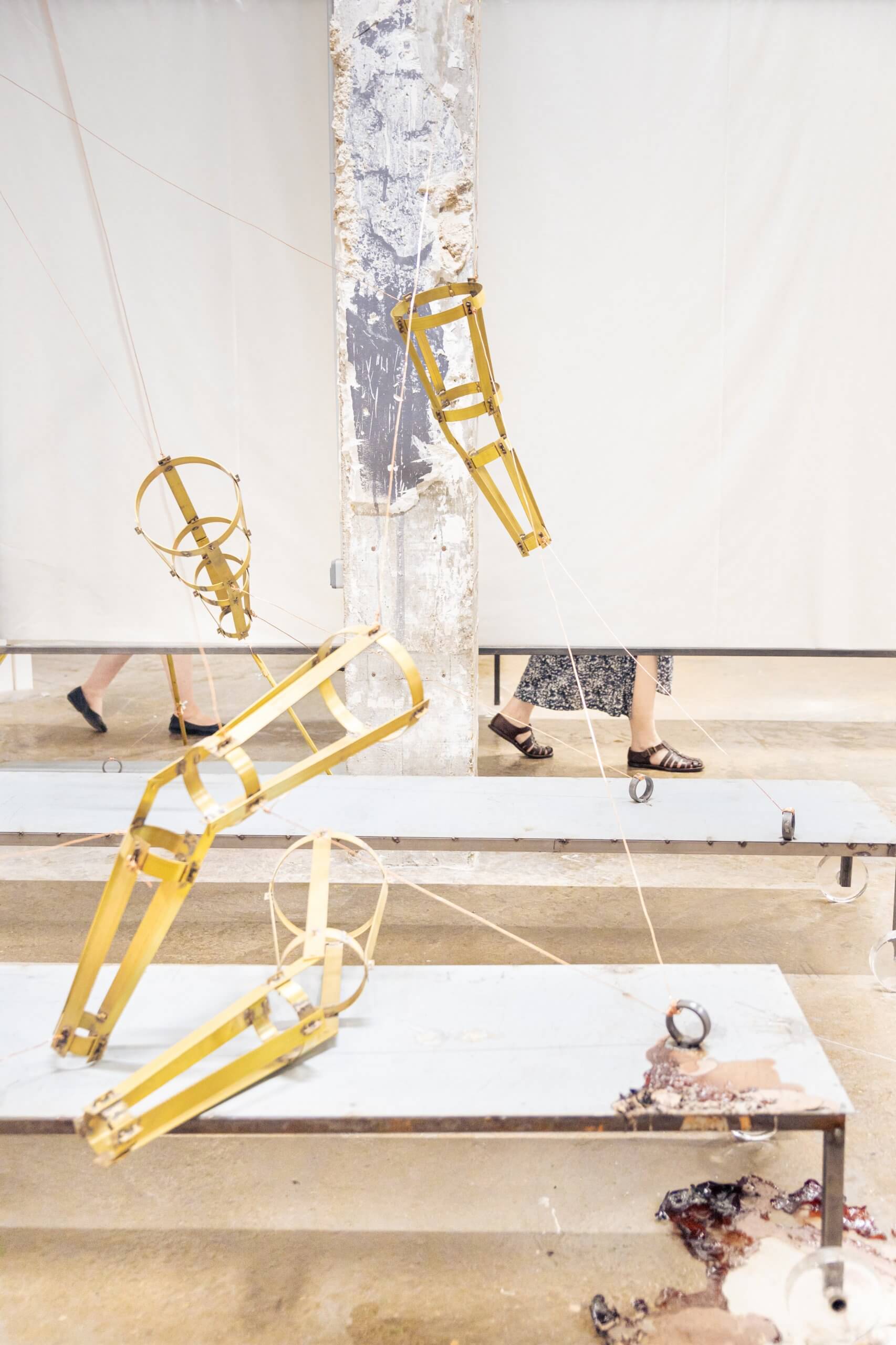 Pour leur exposition personnelle au Palais de Tokyo, les mountaincutters déploient des installations en prise avec le bâtiment, ses fragilités et ses températures, tandis que l’accès au centre d’art se voit inversé à l’heure d’été. Des thermomètres, de l’huile et d’autres liquides enregistrent les variations de chaleur aux côtés de sculptures de mains en bronze et de fémur néanderthalien en cuivre se greffant à l’espace et à son réseau d’eau chaude. Unies au lieu, modelées par ses flux, les sculptures enveloppantes convoquent des corps défaillants dont les prothèses, les excroissances et les extensions sont autant de stratégies d’adaptation à des environnements inhospitaliers.