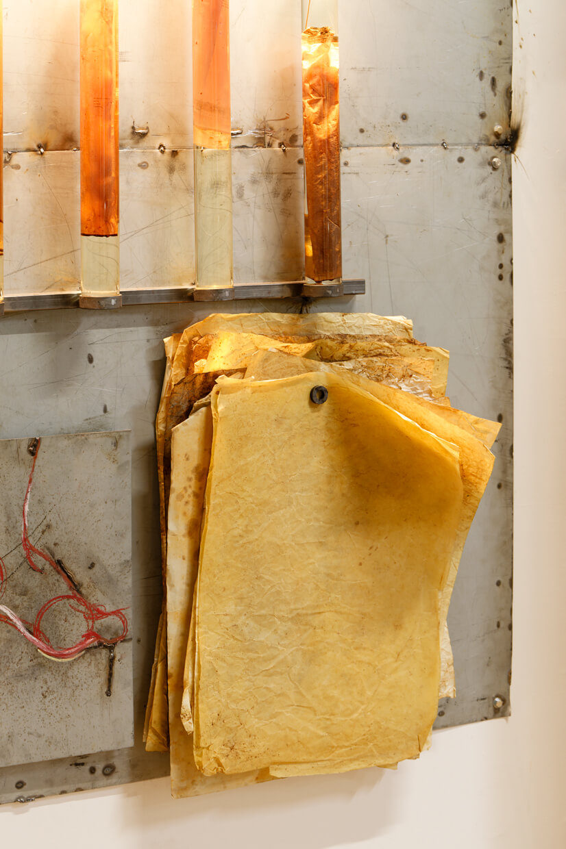 Pour leur exposition personnelle au Palais de Tokyo, les mountaincutters déploient des installations en prise avec le bâtiment, ses fragilités et ses températures, tandis que l’accès au centre d’art se voit inversé à l’heure d’été. Des thermomètres, de l’huile et d’autres liquides enregistrent les variations de chaleur aux côtés de sculptures de mains en bronze et de fémur néanderthalien en cuivre se greffant à l’espace et à son réseau d’eau chaude. Unies au lieu, modelées par ses flux, les sculptures enveloppantes convoquent des corps défaillants dont les prothèses, les excroissances et les extensions sont autant de stratégies d’adaptation à des environnements inhospitaliers.