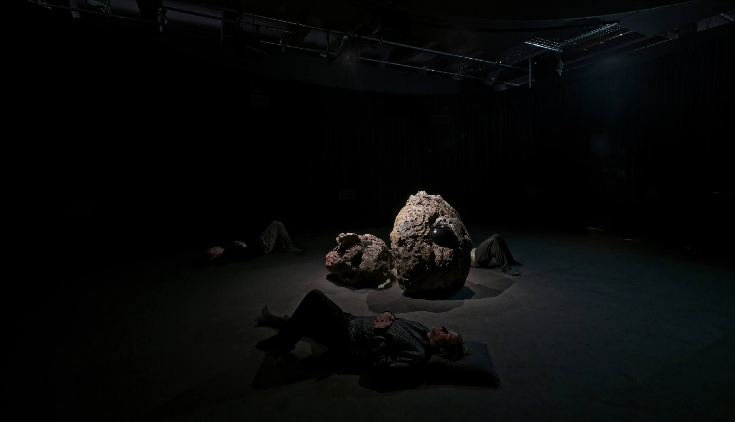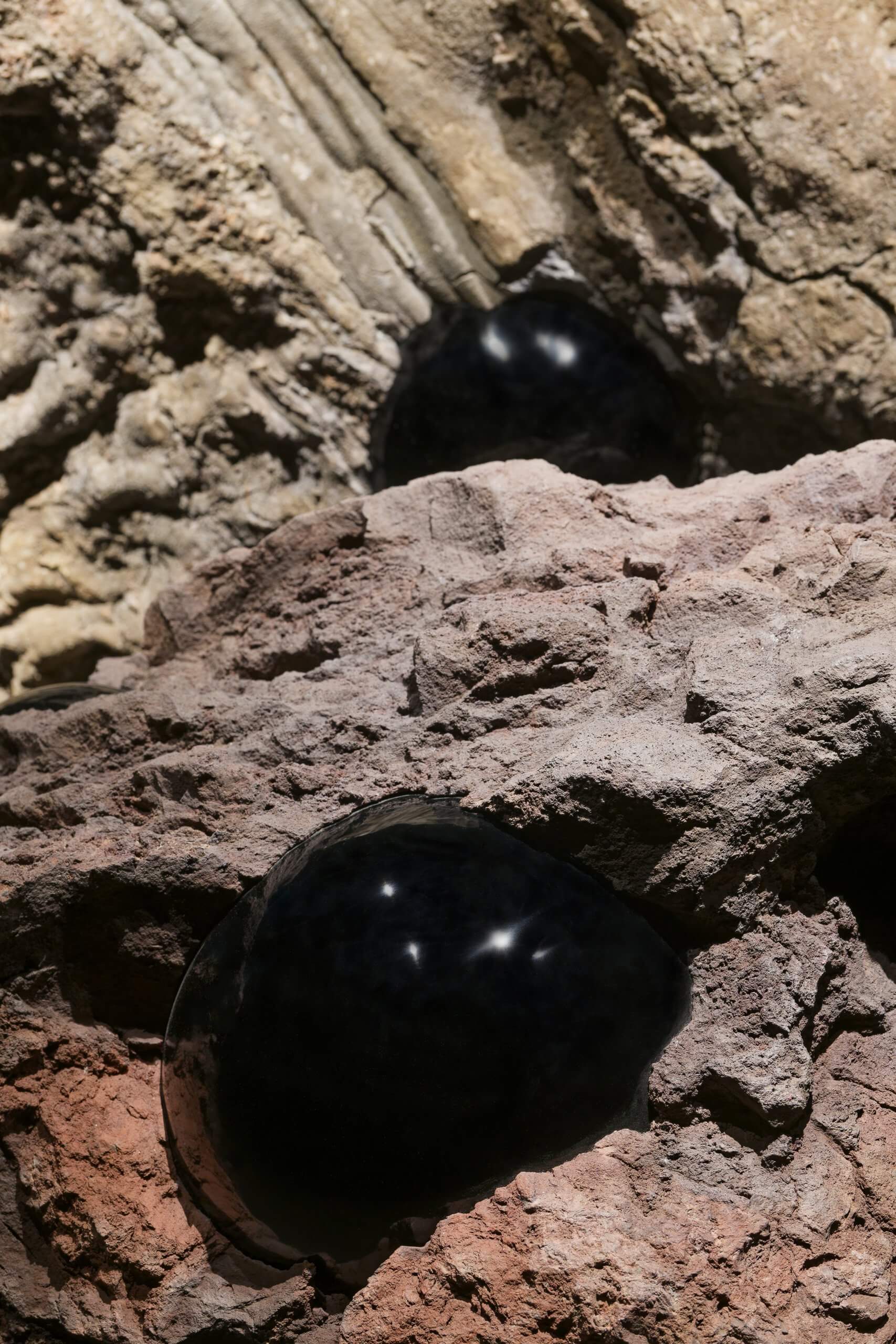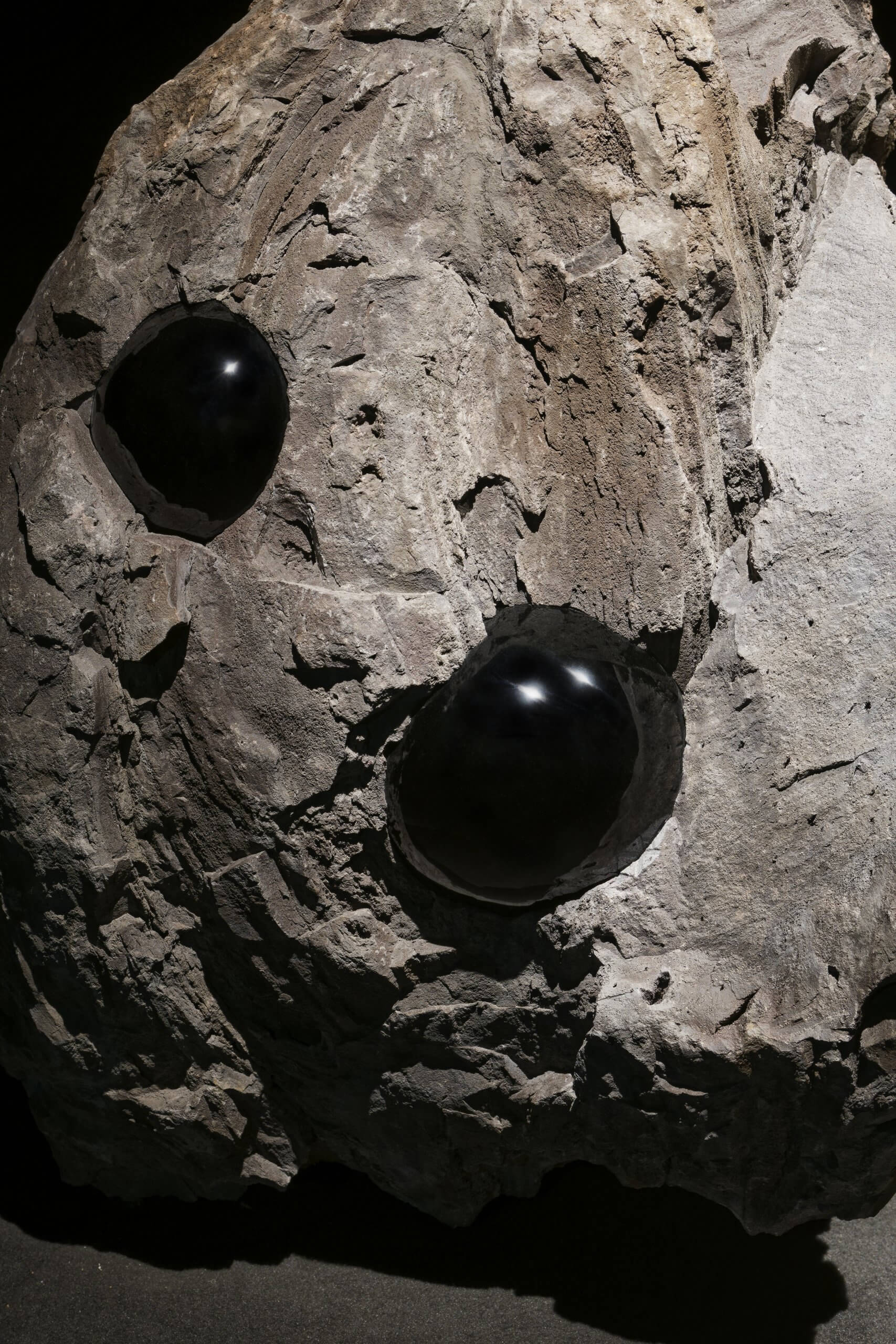 « Stone Speakers – Les bruits de la terre » est une expérience immersive. Elle invite le public à pénétrer dans un paysage volcanique composé de sculptures minérales, au milieu desquelles il entend les conversations primordiales de la terre. À partir d’enregistrements de volcans réalisés en Colombie, Éthiopie, Islande, Indonésie et Italie, Julian Charrière nous met en relation avec les entrailles de la planète, vues non comme un royaume inerte mais au contraire comme un lieu vivant et vibrant. Chambres magmatiques, marées, plaques tectoniques en mouvement s’y mêlent. L’espace d’exposition, transformé en un cratère symbolique, amplifie leurs dialogues grondants et pénétrants. Il crée une chambre d’écho architecturale qui explore notre relation avec d’autres formes de vie, en utilisant un flux en direct de données provenant de stations de surveillance sismique mondiales qui captent les sons de la roche et des plaques tectoniques.