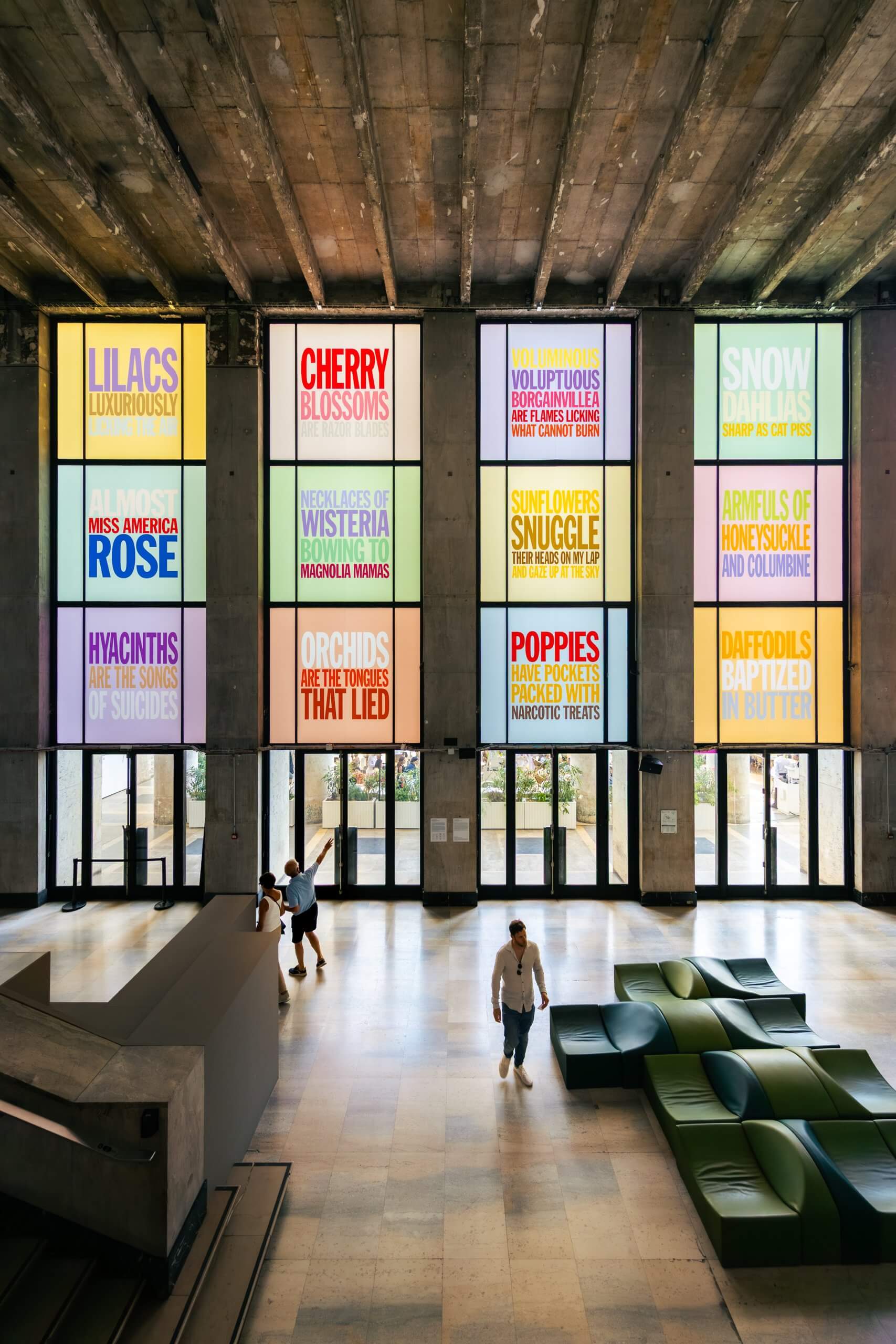 Conçue par l’artiste Ugo Rondinone, elle transforme une sélection de peintures de la série Welcoming The Flowers (2007) issues de son poème éponyme, en un vitrail éclairé par la lumière du soleil. Dans cette version inédite, le thème des fleurs est lié à la lumière naturelle, créant un jardin vertical de lumière, de couleurs et de mots célébrant l’amour, la sexualité, la spiritualité et l’engagement sociétal et politique.