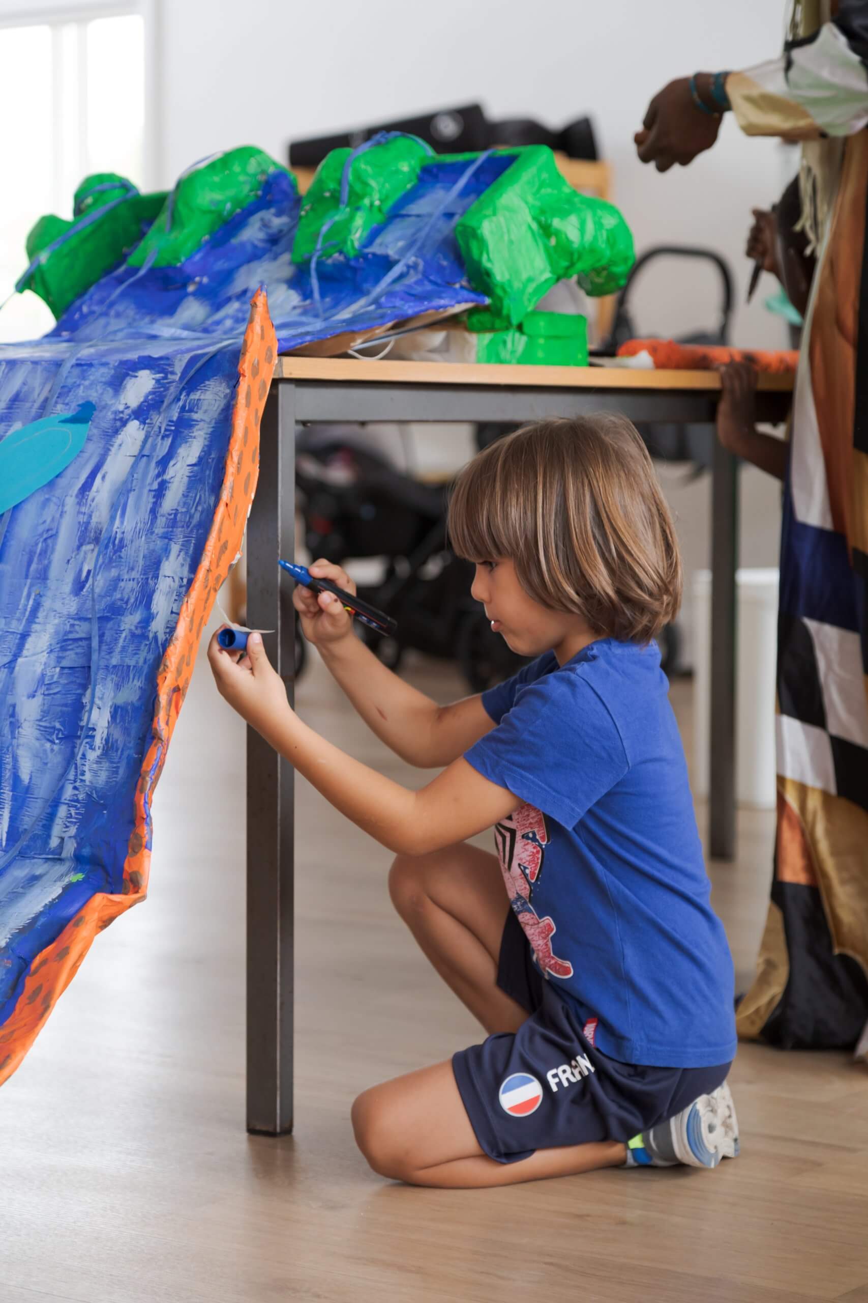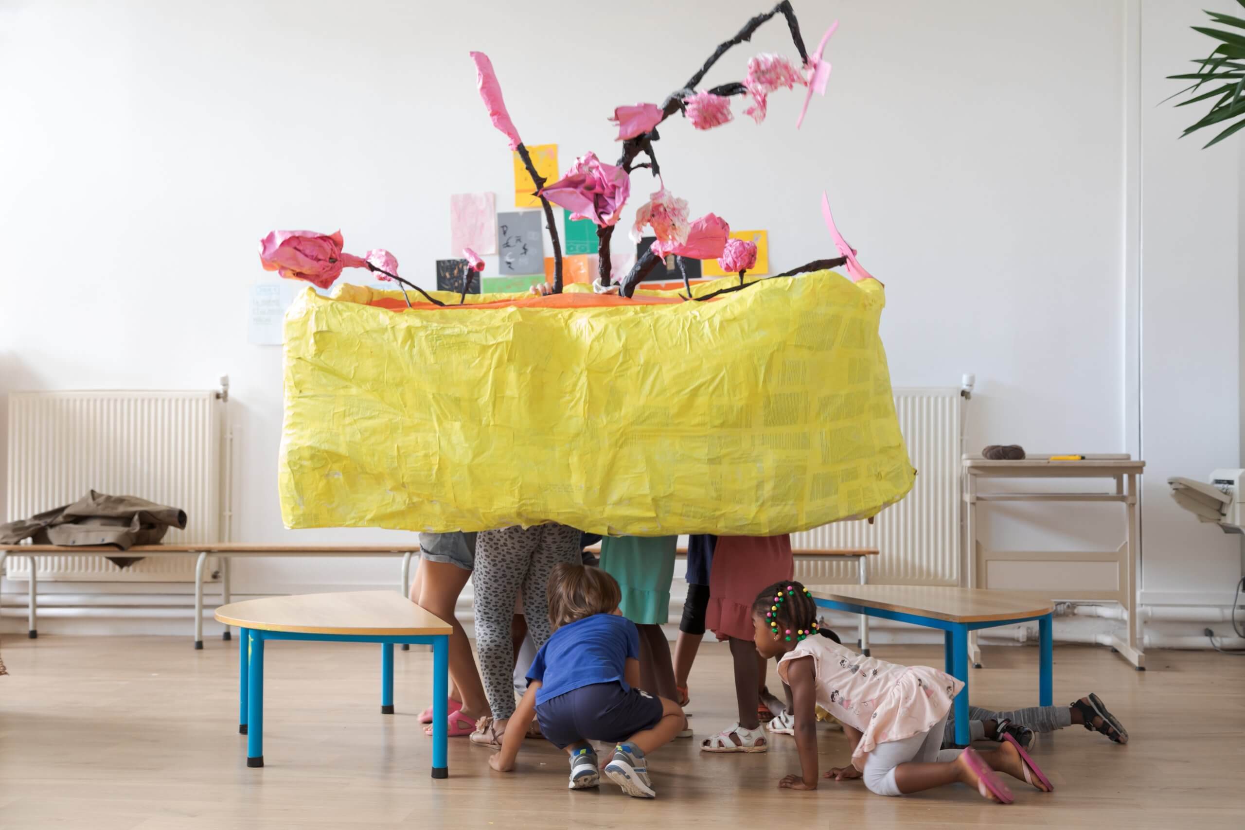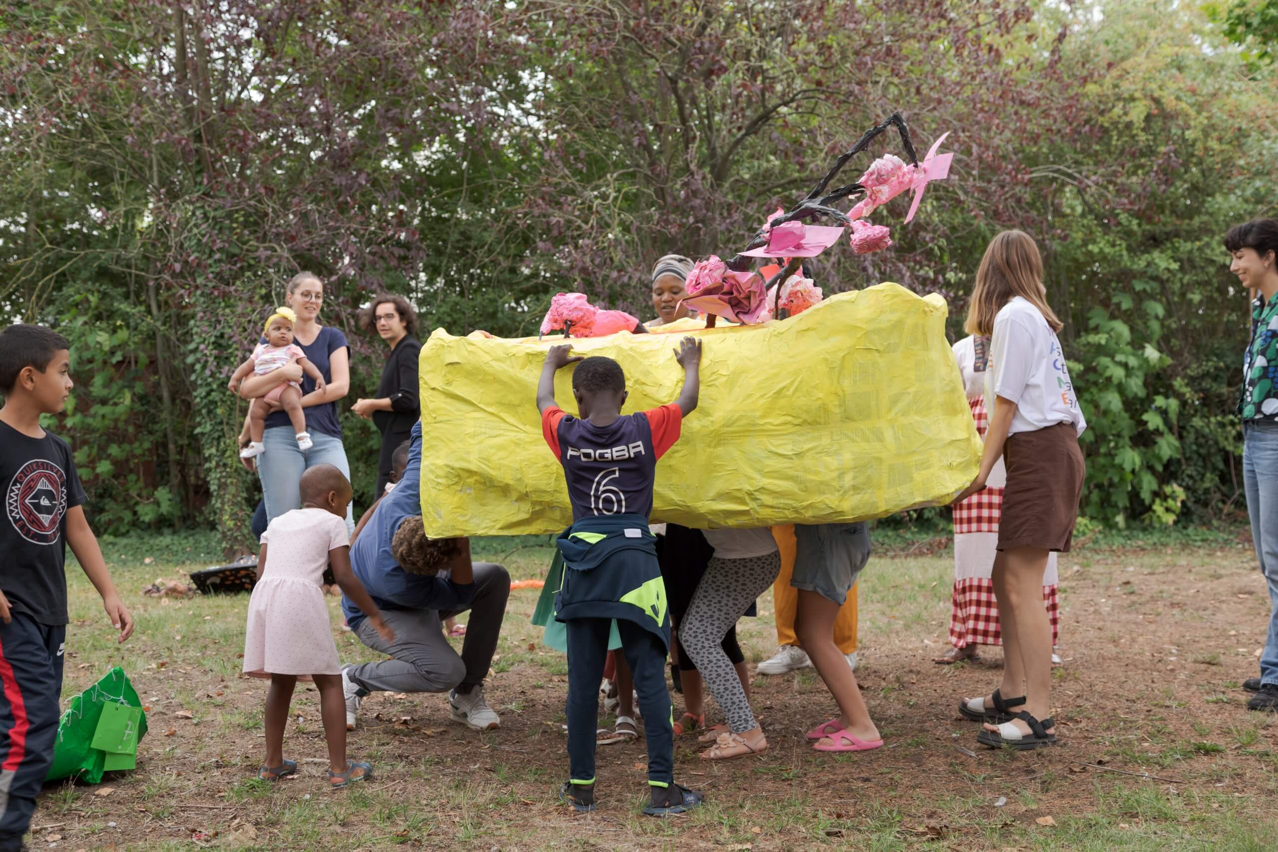 Dans le cadre du programme Y·A·C·M·É, Mélanie Hilaire a imaginé un atelier à destination des bénéficiaires du Centre d’Action sociale de la ville d’Égly. Les familles participantes ont été invitées à créer un ensemble de sculptures géantes inspirées du « jardinier-panseur », figure inventée par l’artiste qui porte attention, bienveillance et soin à son environnement. Les familles ont pu activer ces créations lors d’une performance finale afin de restituer les gestes des jardinier·ères comme un rituel de soin à la terre.