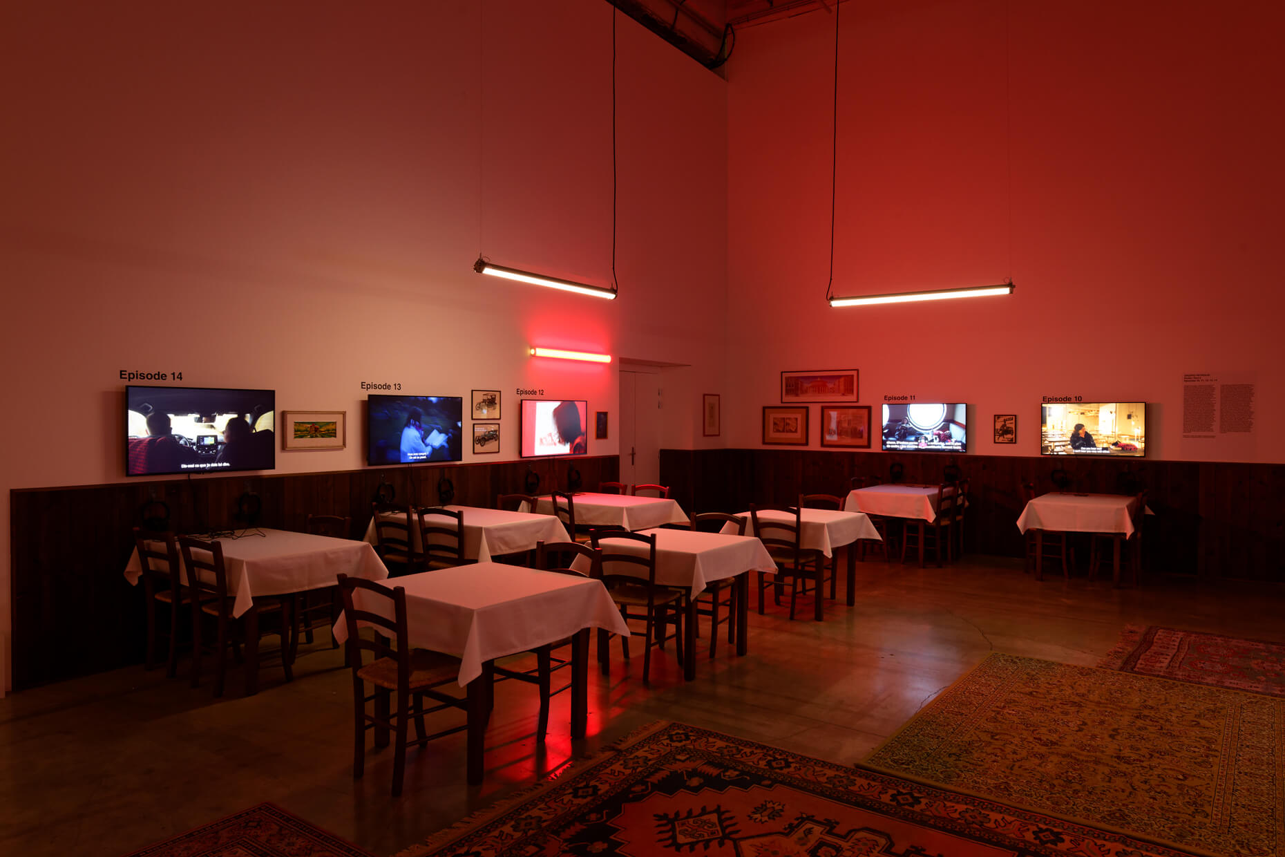 LRD : Dans l’espace d’exposition de Gruppo Petrolio, il y a dix-neuf écrans qui correspondent aux dix-neuf épisodes du film. Mais ce n’est pas une série, c’est comme un très long film qu’on découpe pour qu’il soit plus accessible. C’est aussi lié au mode de production. On est dans le réel, donc on écrit au fur à mesure et la veille pour le lendemain avec le réalisme des moyens qui sont les nôtres. Les décors, c’est un peu la même idée. Par exemple, le décor de la trattoria, c’est un décor que j’ai utilisé précédemment dans un film qui est un portrait de Pasolini. C’est une trattoria qui est une reproduction, mais pas fidèle, du dernier restaurant où il a mangé avant d’être assassiné. Et donc on l’a récupéré pour ce film. Je l’ai aussi utilisé comme salle de cours dans l’école dans laquelle j’enseigne, là où on a commencé à lire Pétrole. Dans Gruppo Petrolio il y a vraiment une idée d’économie, l’idée de réutiliser et recontextualiser pour faire des choses complètement différentes. L’autre décor est composé par des éléments de mon atelier à Grenoble. C’est un atelier un peu froid, comme un grand garage avec un sol en béton et des courants d’air donc j’ai installé plein de tapis qu’on a colorés et qu’on retrouve dans l’exposition. C’est une technique de l’artiste autrichien Franz West qui colore des tapis avec des encres. Il y a aussi des affiches qu’on a mises en commun avec toutes ces personnes qui viennent faire des choses dans mon atelier. Ces décors sont très importants et on les remet dans l’exposition. Un peu comme ce qu’on fait en remettant les chambres d’hôtel.