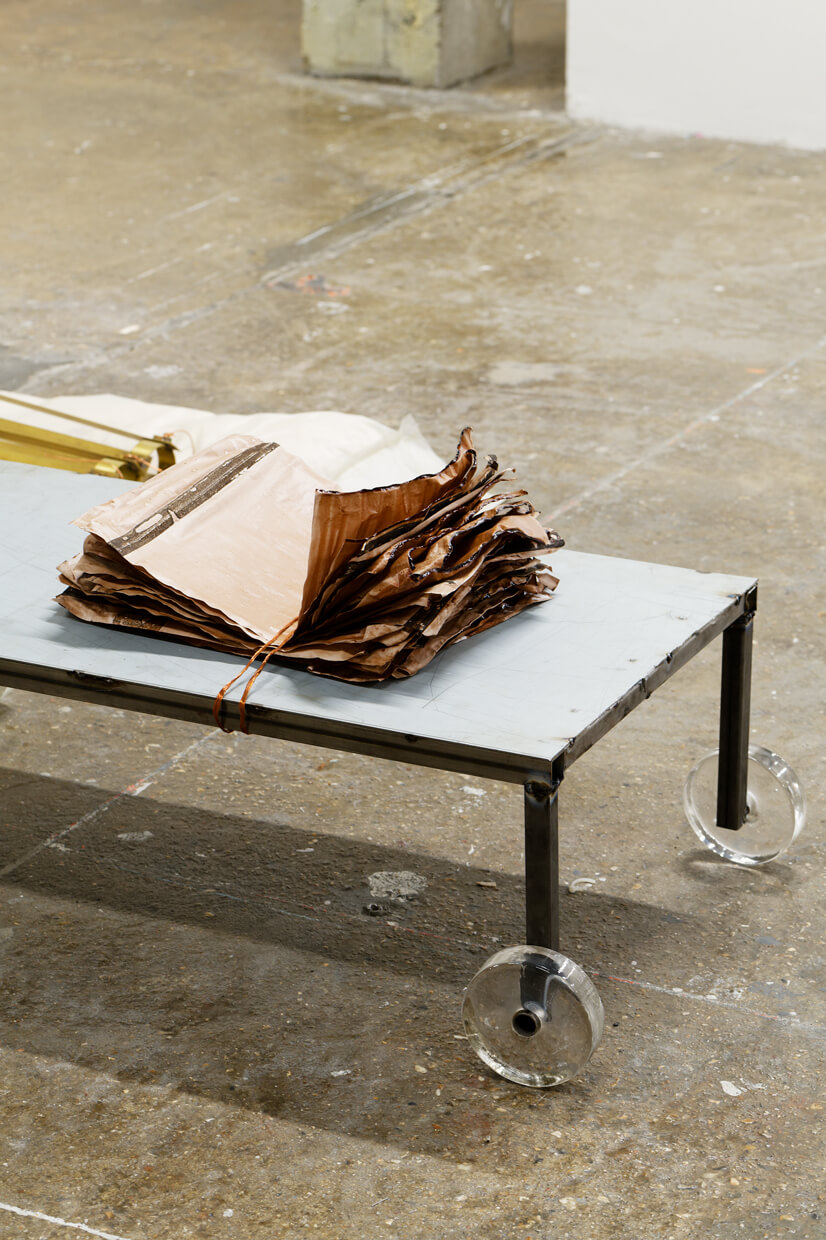m : Notre exposition a été dictée par le lieu qui l’accueille. Il est constitué de deux typologies d’espace que nous avons fusionnées en abattant une cloison. Dans l’espace du Tarmac, nous avions la sensation qu’il y avait quelque chose de très structurel. Ses colonnes évoquaient beaucoup les questions de fragilité de la structure, et donc pour nous, également la fragilité des corps. Le second espace, plus blanc, plus lisible, peut être plus neutre, se prêtait quant à lui au développement horizontal. L’idée de l’archéologie pouvait s’y développer et ainsi créer un moment de bascule entre corps, environnement et origine. L’enjeu du climat a aussi influencé notre projet . Pour cette saison d’expositions, le sens de circulation est inversé au Palais de Tokyo. Le public pénètre par les sous-sols et tous les espaces habituellement les plus visibles, remplis de lumières et donc de chaleur, sont laissés vides. Nous avons souhaité travailler les questions de fluides et de températures à travers la présence de thermomètres dans l’espace. Ce sont des indicateurs indiciels, ils nous donnent une information, mais demeurent en même temps de simples détails dans un espace aussi grand . Le public sera amené, ou non, à le découvrir. La question de la température est toujours à la fois inquiétante et invisible. Nous avons souhaité travailler autour de la question des normes PMR (Personnes à Mobilité Réduite). Notre travail est parcouru par la question des corps défaillants que nous envisageons comme quelque chose de positif, comme un vecteur de production de formes et d’énergie. Dans l’espace d’exposition, il y a un passage à niveau qui est matérialisé par une rampe PMR. Nous avions envie de lui donner une place centrale, ou du moins très importante, dans ce projet. Cette rampe, habituellement utilisée seulement par les PMR, devient ici le seul passage possible, quels que soient les corps. Il y a eu cette intention de vouloir la rendre sculpturalement visible dans l’espace, qu’elle soit porteuse d’une énergie, dans la mesure où le laiton est une matière très conductrice. Avec le passage du public, cette rampe va s’altérer, elle n’aura plus la même lisibilité. Nous souhaitions montrer l’incidence des corps qui passent, mais aussi celle des roues des poussettes et des fauteuils roulants.