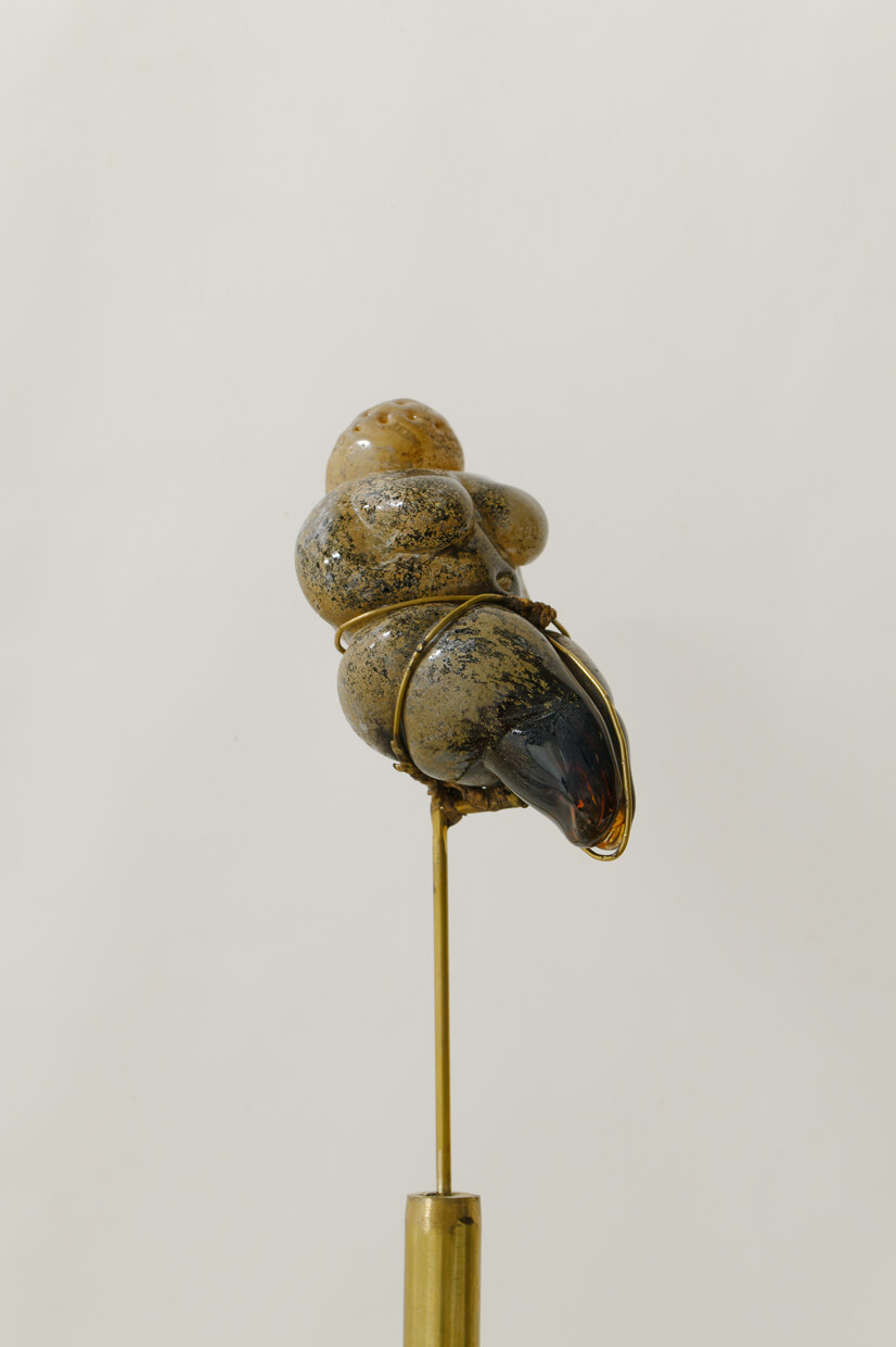 m : Le mode opératoire et le choix des matériaux sont très liés parce que nous avons une pratique de l’installation in situ. Le lieu est considéré comme une matériologie que nous utilisons. Les matériaux sont construits par rapport à notre parcours, le contexte dans lequel nous avons évolué. Nous utilisons principalement de l’acier, de la céramique, de la terre, de l’argile et du verre. Ce sont souvent des matériaux qui se transforment avec le feu. Nous avons commencé avec de la terre très brute. Puis, c’est devenu la terre avec le feu. Par principe de fusion des minéraux et de chimie, en réalisant nos propres recettes d’émaux, mélanges d’oxydes et de matières premières. Jusqu’à expérimenter le verre, qui est une technique elle aussi très précise, et qui se travaille plus dans le vif du chaud. Progressivement nous sommes passés du cru au cuit. Notre matériologie s’agrandit à chaque nouveau projet. Nous avons des matériaux qui nous suivent. Il y a l’acier qui est pour nous un support, une structure fonctionnelle. Comme une ossature ou un prolongement du corps qui permet de faire fonctionner un système d’objets et de matières dans l’espace. Nous avons également un travail d’atelier qui passe beaucoup par le dessin, ainsi qu’une pratique de glanerie. Nous allons chercher des objets qui ont une charge, une mémoire, des objets qui sont liés à des enjeux qui nous intéressent. Nous venons les greffer à nos sculptures pour les confronter à d’autres matériaux et références et ainsi faire travailler une mémoire de façon différente, peut être de manière fictionnelle. Que ce soit à l’atelier ou dans l’espace d’exposition, ce qui nous importe est la manière dont ces matériaux viennent se déposer dans l’espace et comment on laisse les gestes et les incidences s’y propager. C’est pour nous une mise en relation, une filiation fictive d’éléments qui n’auraient peut être pas dû se rencontrer parce qu’ils appartiennent à des temps différents. Il y a dans notre travail cette idée que le corps est une sorte de territoire biologique à travers lequel il est possible de remonter dans le temps. L’anatomie est une sculpture qui s’est développée tout au long de l’évolution humaine. C’est cette modification de la structure humaine qui est dans l’exposition reliée avec des choses plus externes, par exemple des matériaux bruts comme le cuivre, un matériaux très conducteur, mais aussi des images archéologiques, des statuettes, des références au Paléolithique. Comme une fouille qui se formalise.