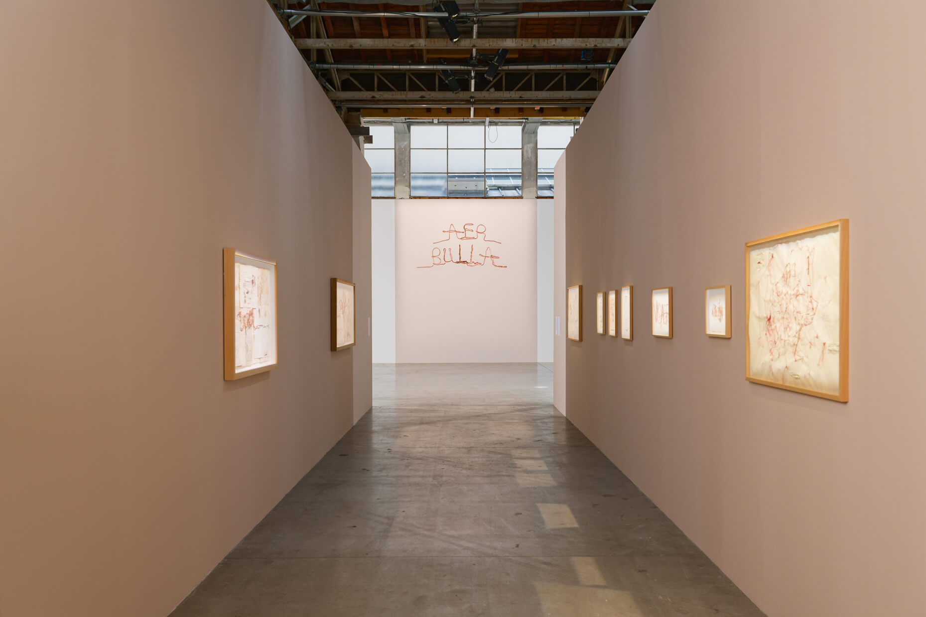 MM : J’avais très envie de penser l’exposition comme un grand monde ou un grand corps, après nos expériences de confinement, interrogeant le commun, la transmission, l’histoire, l’écrit, le politique, le social. Comment penser ensemble ce monde dans lequel nous sommes connecté·es de manière organique. Ce n’est donc pas un « public » mais des présences qui pénètrent dans l’exposition. Il y a les oeuvres politiques comme Service, commencé en 2000, qui est un dispositif avec des fourchettes et de la terre. Par politique j’entends : on regarde le monde et autour de cette table on se demande ce qu’on veut pour nous. Ce n’est pas une démonstration, on est libre de se projeter dans ce récit qui propose des esquisses de pensée. Les dessins viennent ensuite nettoyer le corps et le psychisme, apporter de la clarté. Puis il y a tout le travail de guérison avec La robe envolée qui est une hypnose, et la vidéo Folle, qui touche à la difficulté à choisir parce que tu es sans cesse empêché·e, perturbé·e, déséquibliré·e, désorienté·e. Læ visiteur·trice peut entrer ou non physiquement dans cette oeuvre projetée au sol, la contourner.