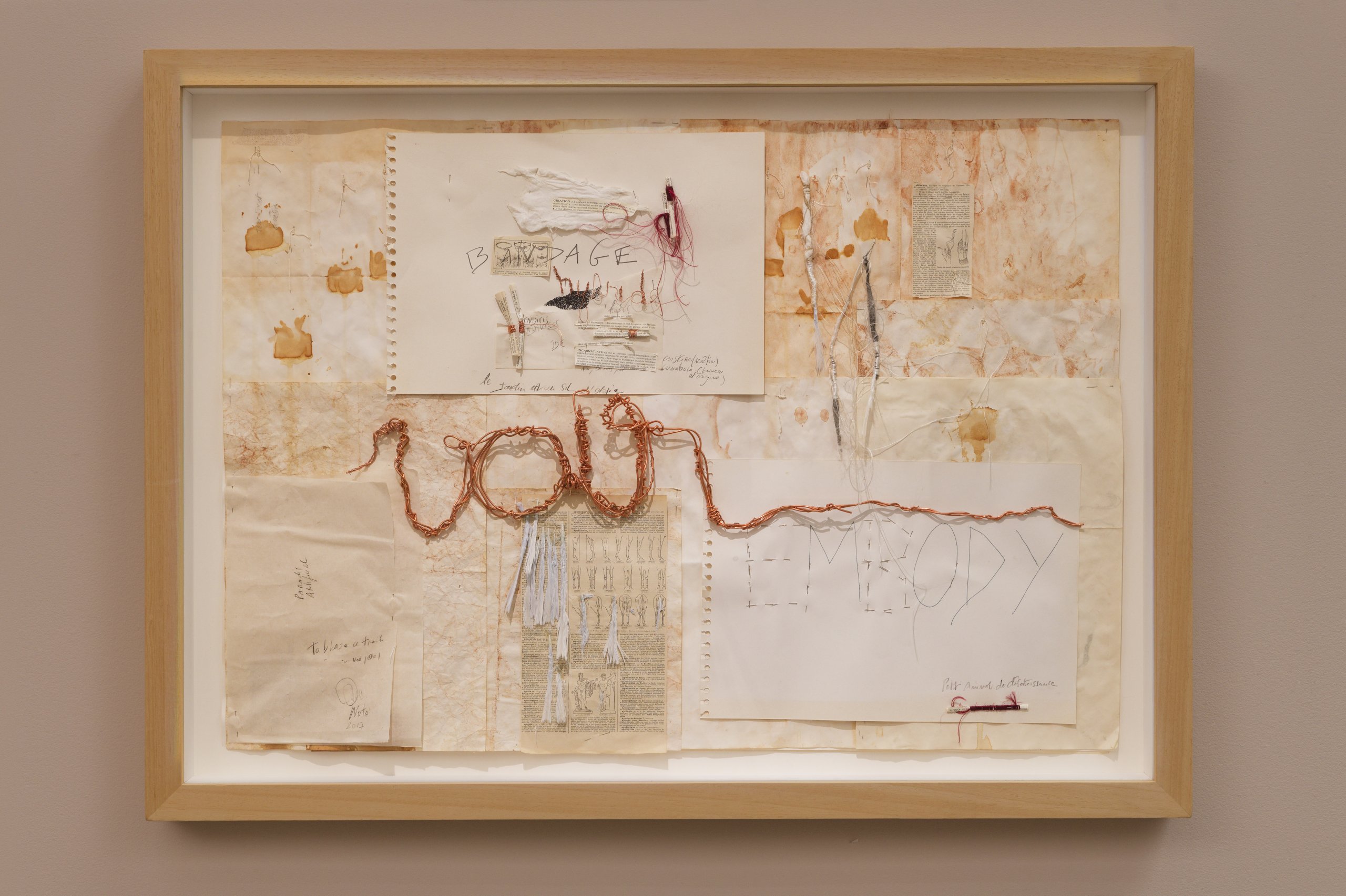 MM : J’ai commencé très tôt à travailler avec du cuivre. Pour les Dogon, le cuivre c’est l’eau, et l’eau c’est la parole. Ce métal existe sur mon territoire. Il est rattaché à des récits d’extraction* mais aussi à des récits plus mystiques. C’est également un conducteur. Il est bon pour notre corps, les veines de la terre, des roches et l’eau car c’est un élément de circulation et de régénération. Le cuivre c’est un peu comme le sang qui circule dans mon corps. J’ai également utilisé du coton. Il a le pouvoir de nettoyer et de purifier. C’est vraiment une fleur magique dans ses propriétés. C’est aussi pour moi une double peau. Au Gabon, les femmes pygmées dessinaient sur le liber ( une fibre contenue sous la partie la plus dure du tronc ). Cette pratique du dessin est un concept, une sensibilité esthétique, une relation spirituelle à cet environnement qui enrichit mon travail. Ensuite, il y a la terre. Elle est liée au déracinement. J’ai vécu dans les Caraïbes et l’océan Indien où il y a cette expérience d’avoir quitté sa terre et de ne plus en garder la mémoire. Et puis la terre c’est aussi Gaïa, la Terre-Mère qui a tant occupé la pensée du philosophe Bruno Latour. Je suis sensible à tous les principes d’extraction, d’occupation, d’arrachement sous un angle symbolique mais aussi économique et politique. Enfin, le thé offre une relation de transsudation*. Aujourd’hui, on dit que l’élément le plus menacé par le changement climatique est peut-être le nuage. Il prend tout ce qu’on ne veut pas voir et quand il pleut, il déverse l’imposture écologique du monde, toutes nos trahisons à la nature. Le nuage a été pour moi une révélation comme la révélation photographique d’une image. Et l’expérience de la révélation de l’image a été marquante dans mon histoire d’artiste. On la retrouve dans mes séries, Déchoukaj’* et Sculptures de chair. Quand je travaille mes dessins, j’opère par trempages successifs parce que j’ai besoin de sentir et trouver ma couleur, une couleur qui soigne. C’est aussi une peau, faite de superpositions et de sédimentations.